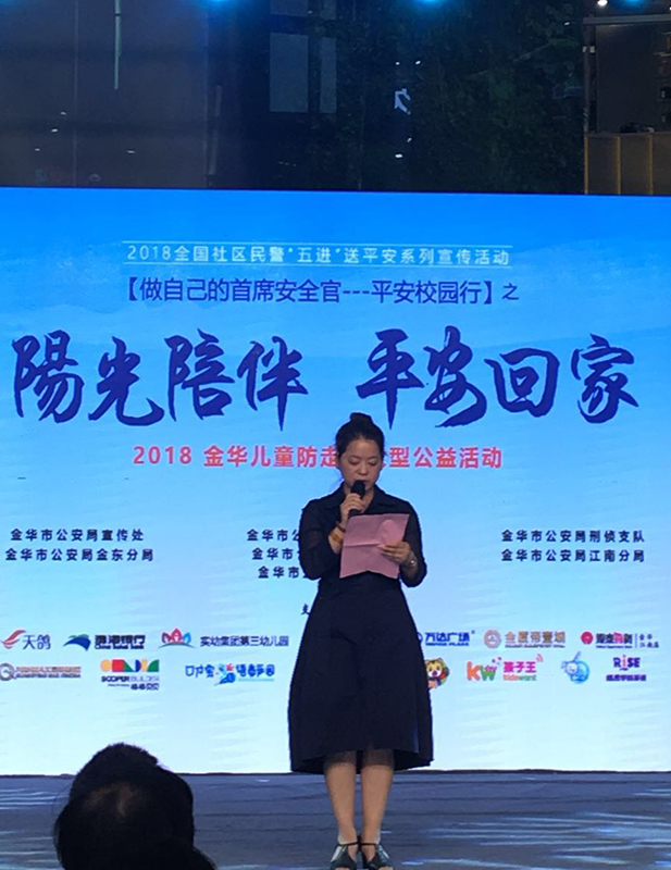 6月2日上午,由金華市公安局、金東區(qū)教育局主辦,金華市實(shí)驗(yàn)幼兒園教育集團(tuán)第三幼兒園、大象家長(zhǎng)會(huì)承辦的“陽(yáng)光陪伴 平安回家-2018金華兒童防走失大型公益活動(dòng)” 在萬(wàn)達(dá)廣場(chǎng)正式拉開(kāi)帷幕。啟動(dòng)儀式上,第三幼兒園園長(zhǎng)倪美芬作為代表上臺(tái)致辭。